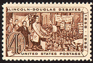 Debates were conducted at Ottawa, Freeport, Jonesboro, Charles, Galesburg, Quincy, and Alton, Illinois. Each debate attracted crowds of between 10,000 and 15,000 persons. The debates were for the 1858 contest for U.S. senator from Illinois. Douglas (clan Douglas) won the election. Allowing Lincoln to become such a national figure that two years later he was elected president. 4 cents.