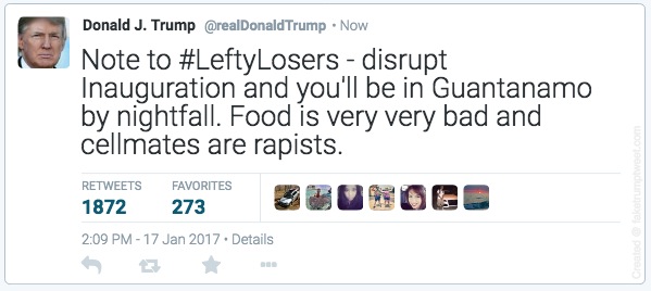 Congressman John Lewis, among 40 or so other elected Democratic plantation owners, will be skipping the inauguration to protest John Podesta’s inability to understand that “password” is not a secure password. Entertainers are running for cover rather than have their names (and careers, if any) forever associated with the Inaugural festivities. New York mayor Bill de Blasio will even spend Inauguration Day taking part in a protest staged at Trump’s NY City International Hotel, linking arms with liberal chowderheads like Alec Baldwin and Michael “Are you going to finish that pie?” Moore.