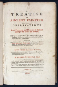 1698 George Turnbull (11 July 1698 – 1748) was a Scottish philosopher, theologian, teacher, writer on education and a figure in the Scottish Enlightenment. He taught at Marischal College, Aberdeen, worked as a tutor and became an Anglican clergyman. Printer Andrew Millar VI (clans Stewart, Lockhart, Hunter).  A Treatise on Ancient Painting containing Observations on the Rise, Progress and Decline of that Art amongst the Greeks and Romans; The High Opinion which the Great Men of Antiquity had of it, its connecxion with Poetry and Philosophy and the Use that may be made of it in Education etc. Some remarks on the peculiar origin character and Talents of Raphael, Michael Angelo, * and other celebrated Modern Masters, and the commendable life they made of the . London Printed for the Author and sold by A. Millar, in Buchanan’s Head over against St. Clement’s Church in the Strand. MDCCXL.
